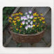 yellow-purple and white-pink violas nicely arranged in a braided wooden basket