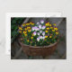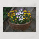 yellow-purple and white-pink violas nicely arranged in a braided wooden basket