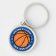 Round keychain featuring a basketball and custom text, for example a name and basketball team, on a blue background. Change fonts and background color, move and resize elements with the design tool.