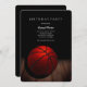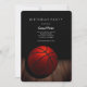 The invitation features a bold, black background that makes the vivid orange basketball pop. The dynamic design captures the energy and excitement of the court, with the ball casting a shadow that adds depth to the scene. The party details are presented in a striking white colour.