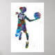 Vibrant watercolor-style artwork depicting a teenage boy playing basketball. The dynamic pose and colourful splashes capture the energy and motion of the sport. This athletic poster design highlights youthful enthusiasm and makes an eye-catching addition to sports-themed wall decor.