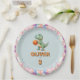 This personalised paper plate for birthday parties features a cute basketball player T-rex dinosaur surrounded by party balloons.