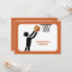 Basketball player with ball custom invitation. It showcases a minimalist icon of a black silhouette of a basketball player trying to put the orange ball in the basket and your text on white background with a border in the same colour of the ball. Some elements courtesy of vectorportal.com.