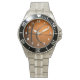 Has heft and feel of expensive stainless steel quartz watches. Good band with safety catch. I removed links, which is easy because engraved arrows show direction to push the linking pins. As always by this seller, the image (a railroad logo) is a perfect reproduction of my emailed image, and is precisely spaced and aligned.