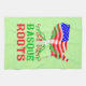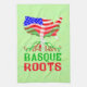 Map of the USA with flags of the Basque Country and American blended into it with the text Basque Roots in red and green.