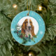 On the front of this Holiday ornament is a beautiful portrait of a Basset Hound Dog peeking out of a holly and evergreen bough. Red berries and pine cones decorate the holly and pine sprigs.The image is placed on a white circle framed by a retro blue snowflake pattern. The back of the ornament has the same background and circle with your custom text in blue on a white background.