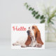 This fun canine post card features a big ear Basset Hound puppy dog highlighted against a crisp white background with a hello greeting printed in a script red font. The back of the card is blank for your message.