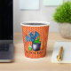 Adorable Halloween design features a bubbling cauldron, of witches brew, with a blue bat. The background is a deep orange with a yellow star pattern. The orange background and text can be customised.
