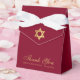 A burgundy and gold favour box for a girl's bat mitzvah. On the flap, it has faux gold foil star of David.