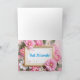 Bat Mitzvah card with a beautiful display of lights, candles, and food; the inside has pink and white flowers surrounding a gold frame with the wish, "Mazel Tov!" Personalise with her name and the date of the event.