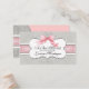 NOTE: This is a flat printed photographic invitation. There are no actual layers, ribbons or jewels on this invitation, though the design looks very realistic. COLOR PALETTE: dove grey, pewter grey, and soft blush pastel pink. DESIGN COLLECTION: Matching Escort Table Seating Assignment Place Cards. This Bat Mitzvah Invitation features in a subtle, sophisticated palette of soft dove grey and pastel blush pink, elegant French copperplate calligraphy style swirls and scrolls in the background, script flourishes, a bracket shaped frame and a beautiful hand painted ribbon look pink bow, with French ruched style satin lace border. All made from original, hand painted watercolor artwork by Audrey Jeanne Roberts. The result is a beautifully modern and contemporary Bat Mitzvah ensemble. On the reverse side there is the same demesk pattern and a bracket revealing a place for your table escort place card, with seating names and numbers. COLORS: dove grey, pewter grey, soft shell pink and white.