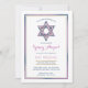 This modern and trendy Bat Mitzvah invitation features a purple, pink and navy blue Star of David with gold accents and a matching border. The text and background colour can be customised to our liking for your daughter's special event.