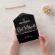 Be proud, rejoice and showcase this milestone of your favourite Bat Mitzvah! Send out this stunning, modern, custom all-in-one invitation for an event to remember. Sparkly gold faux foil, glitter dots and typography script overlay a rich, dramatic, black background. This all-in-one product is an unique combination of a custom invitation, including an evening venue, with an easy to tear off perforated RSVP postcard. Personalise the custom text with your Bat Mitzvah’s name, date, and venue information. Guaranteed to add stylish fun to her special occasion!