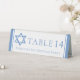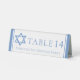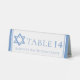 This light blue Bat Mitzvah party table number table tent sign has a beautiful, artistic Star of David drawing at the top. Complete with your personalised name on the white decor.