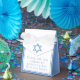This light blue Bat Mitzvah party favour box has a beautiful, artistic Star of David drawing at the top. Complete the decor with your personalised name on the cute boxes.