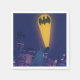 This evocative graphic captures Batman as he oversees Gotham City under the glow of the iconic Bat-Signal. Set against a dramatic night sky, the vibrant yellows and blues create a stark contrast, highlighting the city's sprawling, lit-up skyline and the silhouette of the caped crusader standing vigilant on a rooftop. The Bat-Signal cuts through the darkness, serving as a symbol of hope and a call to action, signalling Batman's unending commitment to safeguarding his city. The composition's dynamic colours and dramatic perspective not only draw attention to Batman's heroic stature but also encapsulate the perpetual struggle between light and shadow in Gotham. This artwork is a powerful portrayal of Batman’s role as the guardian of Gotham, watching over it from the shadows, ever ready to confront the chaos that lurks below.