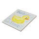 Cute yellow rubber ducky surrounded by bath bubbles, on a decorative bathroom tile!