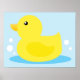 Adorable yellow rubber ducky on a blue background and soap bubbles. Perfect design for your little one's bedroom or bathroom.