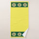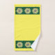 Crochet pattern of daisy in yellows, grey and hunter green. Three flower band at each end of yellow towels. Washcloth shows tiled daisies on green.
