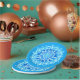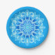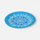 Paper plates in a batik textured mandala / medallion pattern in shades of aqua, turquoise and cobalt blue on a turquoise background