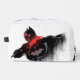This striking artwork captures Batman as he emerges from the shadows, reflecting his dual nature as both a symbol of hope and an avenger cloaked in darkness. The graphic utilises a stark contrast between the deep blacks and vivid reds to emphasize Batman’s intense and complex persona. The left side shows Batman partially obscured by a smoky, textured effect, symbolising the mystery and the enigmatic qualities of his character. The right side reveals his determined profile in clear, bold colours, highlighting his unwavering resolve to fight crime. This artistic depiction combines modern design elements with classic superhero imagery, creating a powerful visual representation of Batman’s ceaseless vigil over Gotham City.