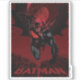 This powerful graphic illustrates Batman in a dynamic action pose, leaping against a backdrop of a blood-red moon and a stormy Gotham skyline. The illustration is steeped in shades of red and black, emphasizing the intensity and danger of the moment. Batman is depicted in full motion, grappling hook in hand, ready to confront the perils that lurk in the night. The city below him is rendered in a detailed wireframe style, suggesting its complexity and the depth of secrets it holds. Rain slashes across the scene, adding to the dramatic tension and the feeling of a high-stakes battle against crime. The artwork conveys Batman's relentless drive and his role as a dark hero in a city that never sleeps, capturing his essence as Gotham’s silent guardian and protector.