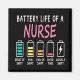 Humorous shift chart showing the battery life of a nurse with colorful levels from start to double shift. Ideal for nursing staff who enjoy relatable workplace humor.