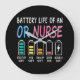 Humorous shift chart showing the battery life of an OR nurse, also known as an operating room nurse or perioperative nurse, with colorful energy levels from start to double shift. Ideal for surgical staff who enjoy relatable workplace humor.