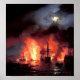 Battle of Cesme at Night - by Ivan Aivazovsky. Oil painting depicting the historic naval battle at Cesme. The composition features sharp contrasts between the dark night background, and the bright orange light coming from the burning battle ships.