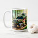The image shows a robust, camouflaged military vehicle stationed in a bright, lush jungle setting. The vehicle's body is painted in green, brown, and tan camouflage patterns, designed to blend with its surroundings. Its large, rugged tires are built to tackle rough and uneven terrain, and its frame is reinforced with armoured plating. A mounted gun turret is positioned on top, ready for combat, and a net cover drapes over the rear compartment, providing additional concealment. The front of the vehicle features a bold, red star, adding a distinctive touch to its design. Sunlight filters through the canopy above, casting a warm, dappled glow across the scene, highlighting the rugged details of the vehicle while the dense green foliage surrounds it, emphasizing the military car’s preparedness for battle in a challenging jungle environment.