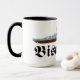 Mug with drawing of the famous German battleship Bismarck of world war II with the name of the ship written with fraktur letters.