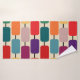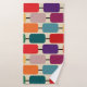 This towel set has a bath towel with a Bauhaus design of rounded rectangles strung together in rows, a red washcloth, and a purple hand towel.