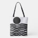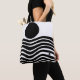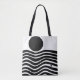 This tote bag has Bauhaus design of wavy lines and circles in black on a field of white.