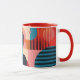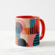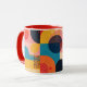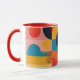 A vibrant abstract geometric composition fills the frame, featuring a tessellation of colorful shapes. Dominant elements include large circles, semicircles, and squares in shades of red, orange, yellow, blue, pink, and dark navy. Some shapes are solid, while others feature textured patterns like fine lines, cross-hatching, or subtle speckles.