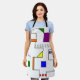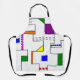 This apron has a Bauhaus design of lines going vertically and horizontally to make a grid with squares, rectangles, triangles, and circles placed around the grid. If you like the design but prefer different colours, message me.