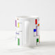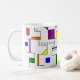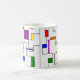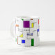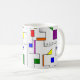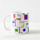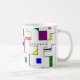 This mug has a Bauhaus design of lines going vertically and horizontally to make a grid with squares, rectangles, triangles, and circles placed around the grid. If you like the design but prefer different colours, message me.