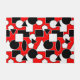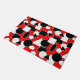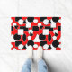 This doormat has a Bauhaus design of triangles, circles, rectangles, and pentagons in black and white on a field of red.