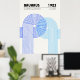Minimalist Bauhaus-style poster featuring geometric blue circular patterns, advertising the 1923 exhibition held from July to September.