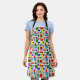 This apron has a Bauhaus design of a grid with squares and rectangles in red, green, blue, orange, light blue, yellow, and red.