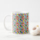This mug has a Bauhaus design of a grid with squares and rectangles in red, green, blue, orange, light blue, yellow, and red.