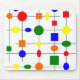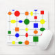 This mouse pad has a Bauhaus design of a grid with shapes in red, yellow, orange, green, and blue plotted on it.