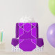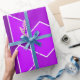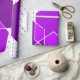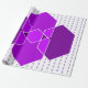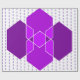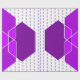 This wrapping paper has a Bauhaus design of overlapping hexagons in shades of purple on a field of white and dotted purple lines.