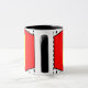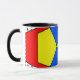 This mug has a Bauhaus design of overlapping pentagons, colored in red, yellow, orange, blue, and green with black dotted lines as a background.