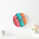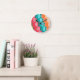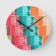 This clock has a Bauhaus-inspired design of shapes and lines in different shades of mid-century modern colors.