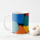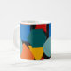 This mug has a Bauhaus design of random shapes in blue, teal, yellow, red, and orange.
