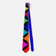 This necktie has a Bauhaus design of random shapes in blue, teal, yellow, red, and orange.