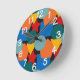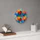 This wall clock has a Bauhaus design of random shapes in blue, teal, yellow, red, and orange.