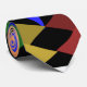 This necktie has a Bauhaus design of random shapes in blue, teal, yellow, red, and orange.