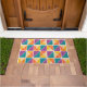 This doormat has a Bauhaus design of squares made of triangles in shades of orange, yellow, purple, and blue.