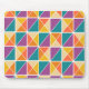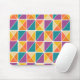 This mouse pad has a Bauhaus design of squares made of triangles in shades of orange, yellow, purple, and blue.
